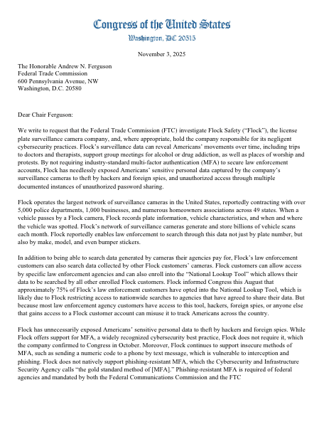Congress’ Letter to the FTC Urging an Investigation into Flock Safety
